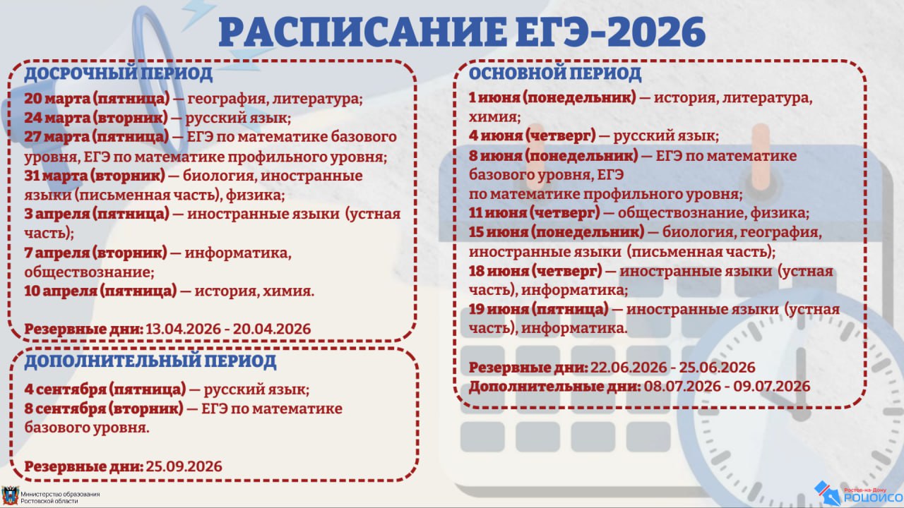 Досрочный период ЕГЭ пройдет с 20 марта по 20 апреля, основной период – с 1 июня по 25 июня, дополнительный период – с 4 по 25 сентября. В каждом периоде предусмотрены резервные дни.